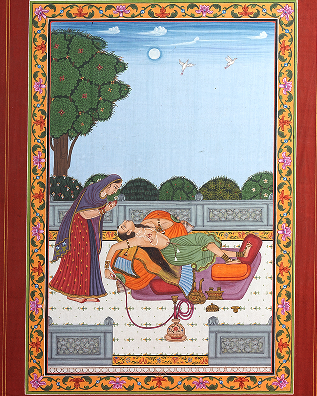 Traditional miniature paintings like this were created using natural mineral pigments, handmade wasli A4 paper, gold or fine detailing pigments as required, and ultra-fine handmade brushes. The process demanded extraordinary patience and precision – often taking weeks or even months to complete a single artwork.