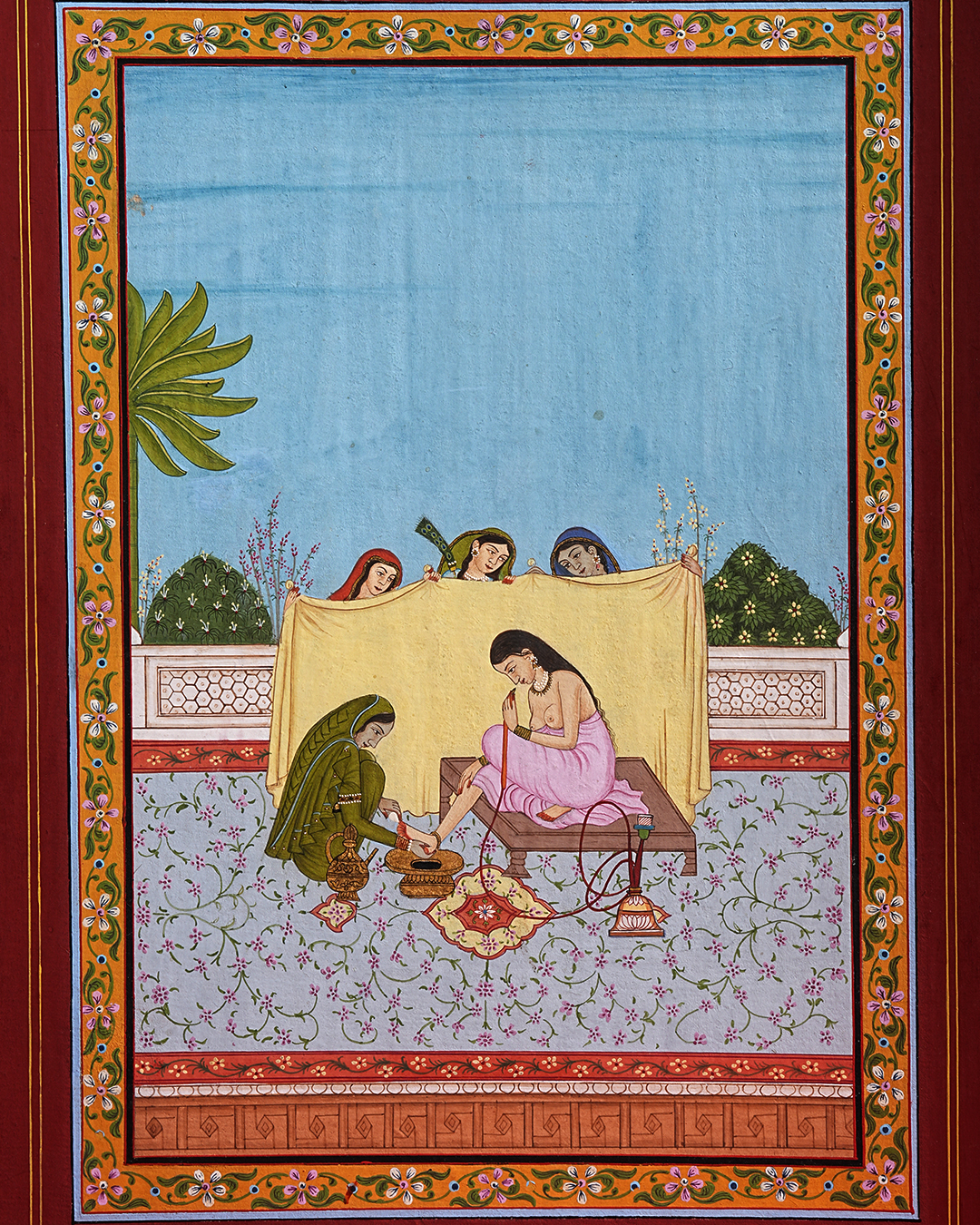 Traditional miniature paintings like this were created using natural mineral pigments, handmade wasli A4 paper, gold or fine detailing pigments as required, and ultra-fine handmade brushes. The process demanded extraordinary patience and precision – often taking weeks or even months to complete a single artwork.